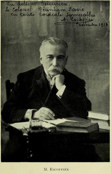 Auguste Escoffier (1846-1935) est considéré comme le "roi des cuisiniers et cuisinier des rois". Chef français de renommée mondiale, il a révolutionné la cuisine moderne et codifié les techniques culinaires dans son œuvre majeure "Le Guide culinaire" publié en 1903 (avec une édition révisée en 1912, celle dont je te parle aujourd’hui). Il a notamment travaillé au Savoy et au Carlton à Londres où il a crée des plats légendaires. Son influence sur la gastronomie française et mondiale perdure encore aujourd'hui.