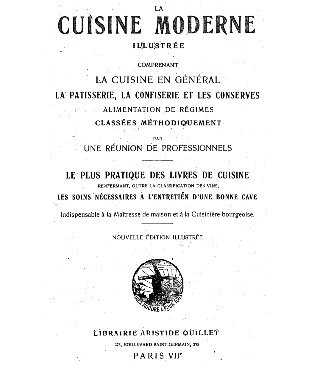 "La cuisine moderne illustrée" est un ouvrage de référence publié en 1927 écrit par "une union de professionnels" et qui s'inscrit dans la tradition des grands livres de cuisine française du début du XXe siècle. Cette période, située entre les deux Guerres Mondiales, marque un tournant important dans l'édition culinaire car les ouvrages cherchent à codifier et préserver les recettes traditionnelles régionales tout en les adaptant aux cuisines modernes de l'époque.