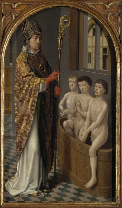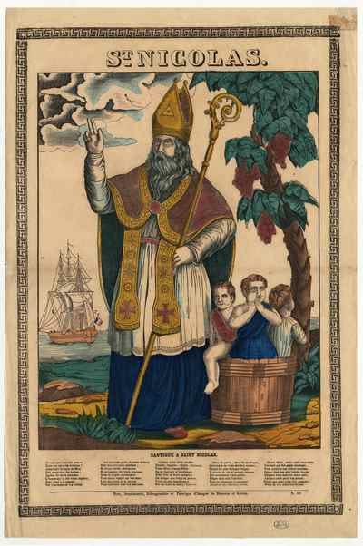 Sa légende la plus connue est celle des trois enfants qu'il ressuscita miraculeusement. Après avoir passé la journée à ramasser les restes de récoltes, trois enfants n’ayant pas vu la nuit tombée, demandent de l’aide à la première maison qu’ils voient. C’était celle d’un boucher qui les tua, les découpa en morceaux et les mit au saloir pour en faire du jambon (super sympa !). Sept ans plus tard, Saint Nicolas passa par là et demanda au boucher de le nourrir, insistant pour consommer le petit salé préparé sept ans plus tôt. Effrayé, le boucher s'enfuit et Saint Nicolas ressuscita les trois enfants. Cette légende est à l'origine de la chanson traditionnelle "Ils étaient trois petits enfants" que l'on chante encore aujourd'hui (cf. la fin de cet article).