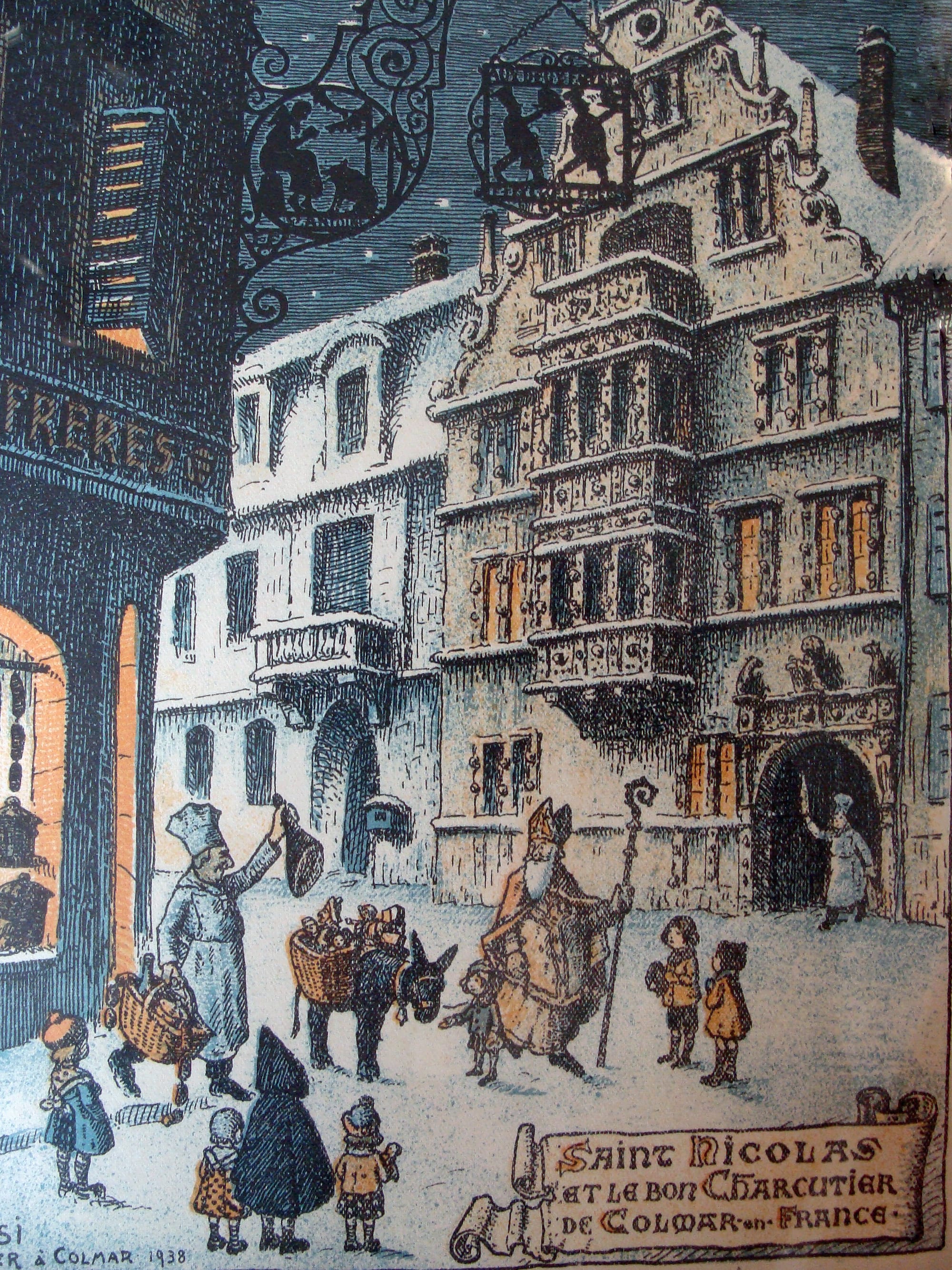 Peinture 1 : La Visite de St Nicolas - Paul Kauffmann (1902)|Peinture 2 : Two Legends of St Nicholas - Gerard David (1500 - 1510)| Illustration 3 : St Nicolas qui sauve les enfants|Illustration 4 : St Nicolas en Alsace|Gravure 5 : St Nicolas, Jean Chièze (1940) |Illustration 6 : St Nicolas qui rend visite aux familles