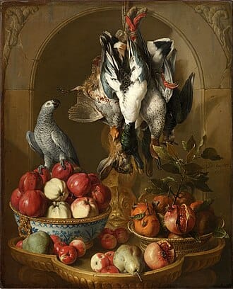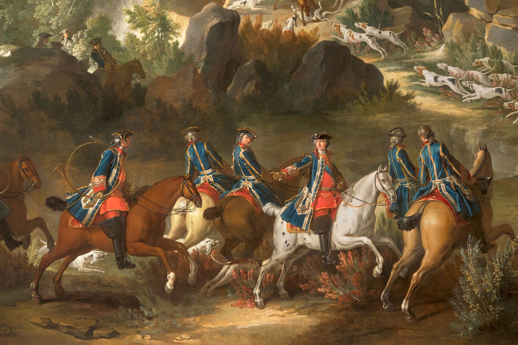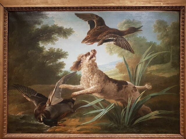 Peinture 1 : Les Chasses royales de Louis XV - Jean-Baptiste Oudry|Peinture 2 : Nature morte au trophée de gibier, fruits et perroquet sur fond de niche - Alexandre-François Desportes (1716)| Peinture 3 : Nature morte au lapin et à la perdrix - Suzanne Valadon (1930)|Peinture 4 : Autoportrait en tenue de chasse - Alexandre-François Desportes (1699)|Peinture 5 : Chien barbet faisant lever deux canards dans les roseaux - Jean-Baptiste Oudry (1752) |Peinture 6 : Nature morte - Jean-Baptiste Oudry (1742)