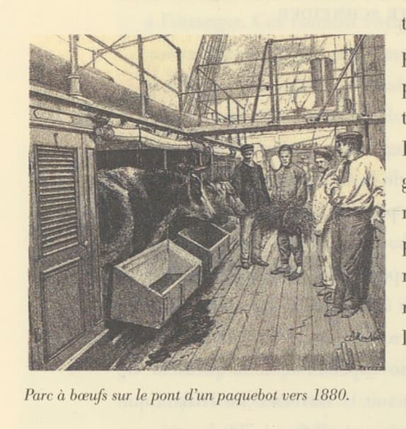Illustration 1 : Dessin d'un parc à boeufs sur le pont d'un paquebot vers 1880 - Papilles | Illustration 2 : Photo des boulangers du bateau - Archives de Saint-Nazaire | Illustration 3 : Photo de la cuisine principale du Normandie - Archives de Saint-Nazaire