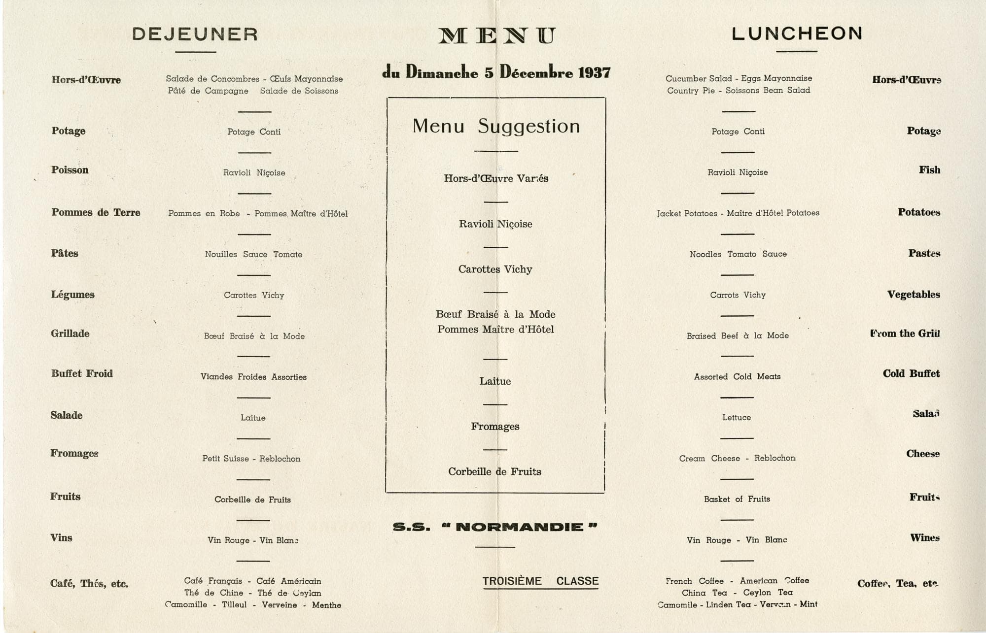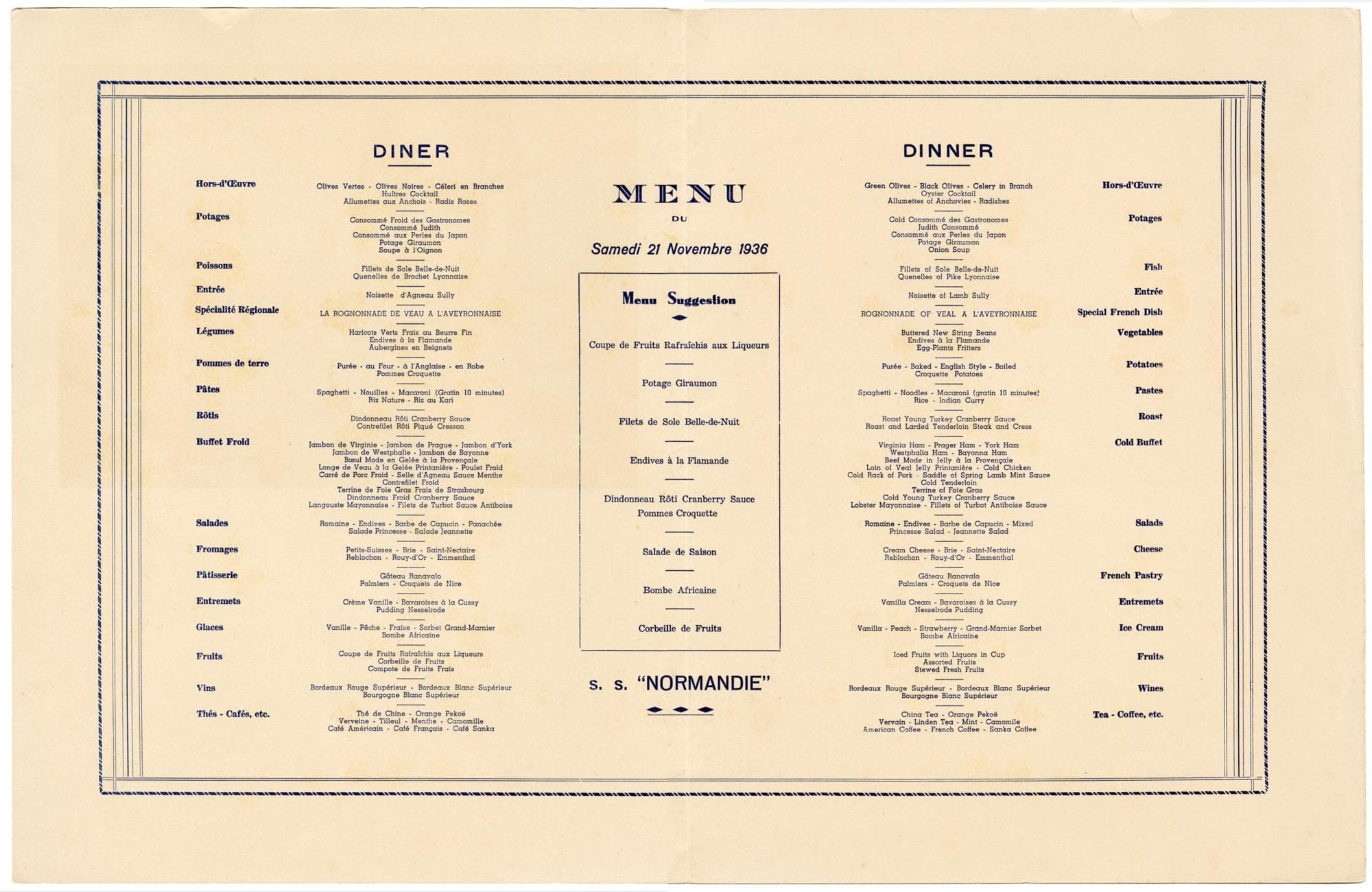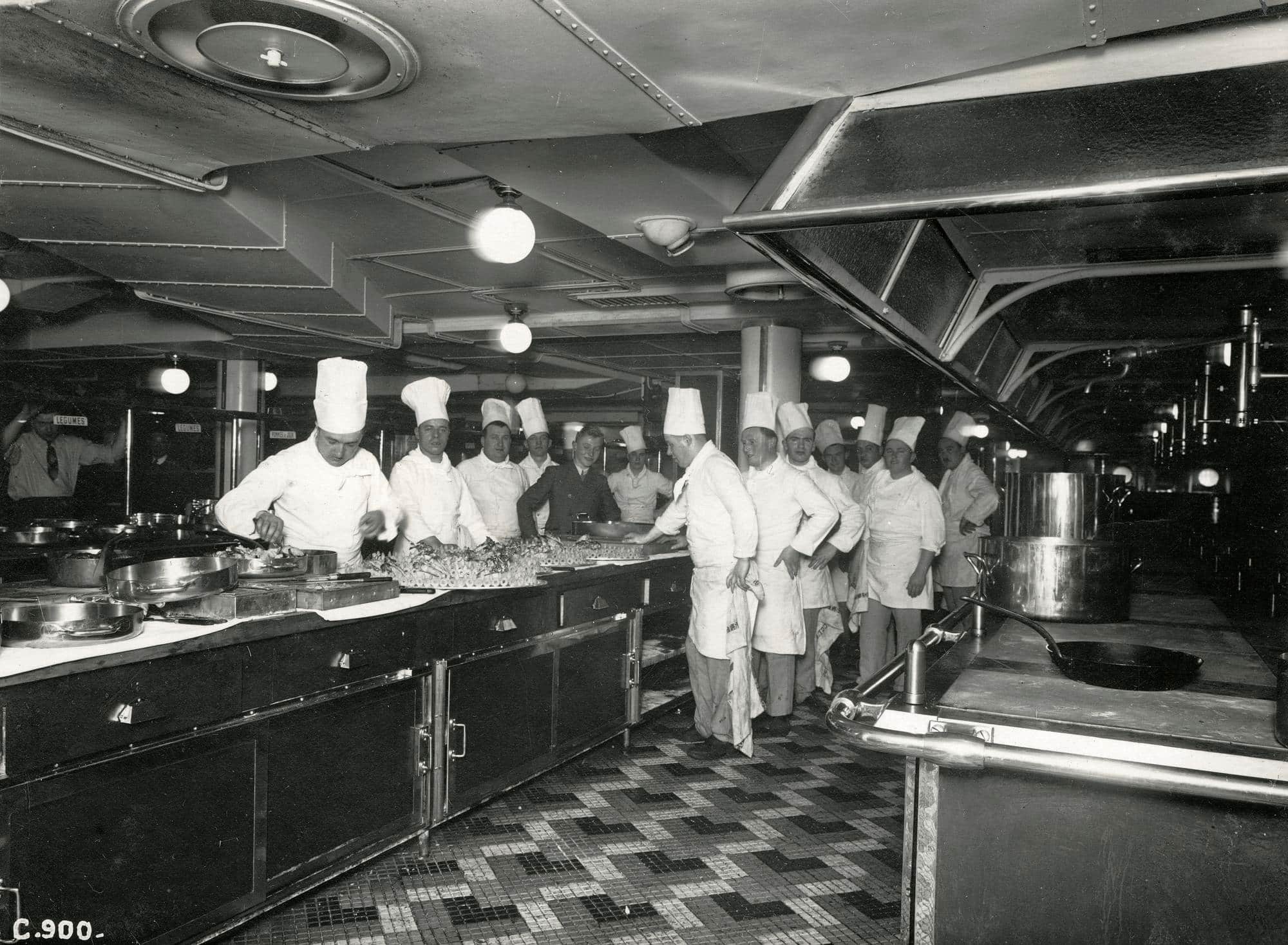 À la fin du XIXème siècle, l’arrivée de l’électricité à bord change tout. Grâce au froid industriel, les menus se diversifient. Sur le Normandie, les plats sont issus des grands classiques des figures de la gastronomie française comme Escoffier ou Carême. Les passagers, peu importe les classes, avaient le droit au meilleur du service et de la cuisine française. En première classe, on retrouvait du caviar, homard ou encore du foie gras et en troisième classe, du bœuf braisé par exemple.