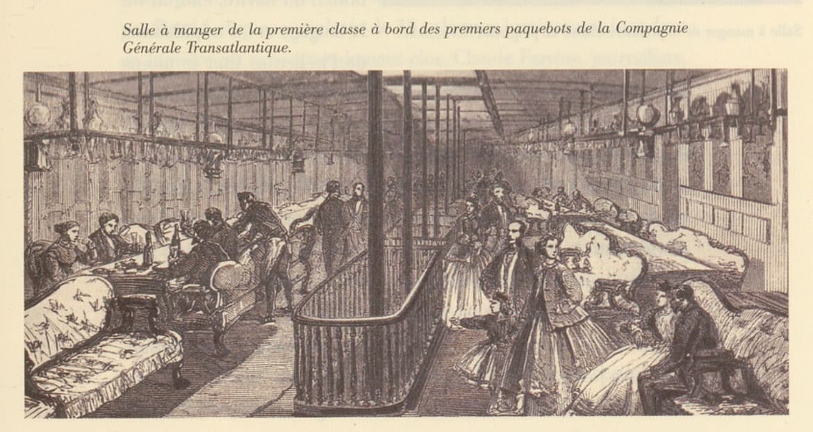 Je remonte un peu dans le temps pour te parler d’une évolution majeur dans les cuisines des paquebots. En 1864, lors du lancement du paquebot Washington, l’approvisionnement était bien différent. La traversée de l’Atlantique durait deux semaines et pour être certain d’avoir de la viande fraîche (sans système de refroidissement) … ils amenaient les animaux vivants qui vivaient sur le pont du bateau. L’implantation de glacières, avec de la glace importée notamment de Norvège (à 40 francs la tonne en 1885), permet progressivement d’élargir la gamme des aliments avec par exemple plus de poissons et crustacés.